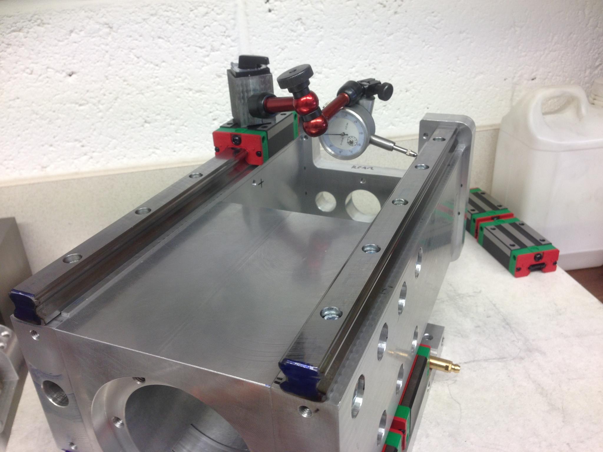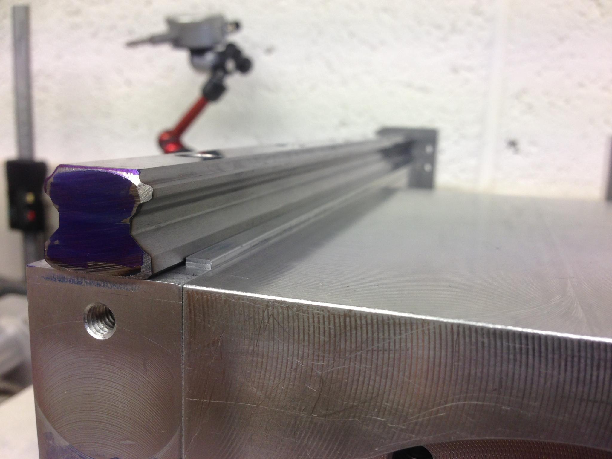 Then checking the vertical alignment showed that the 2nd rail was ~0.05-0.1 high towards one end. The large side plates they sit on will need the M12 bolts loosening and knocking round slightly when this goes together for real.