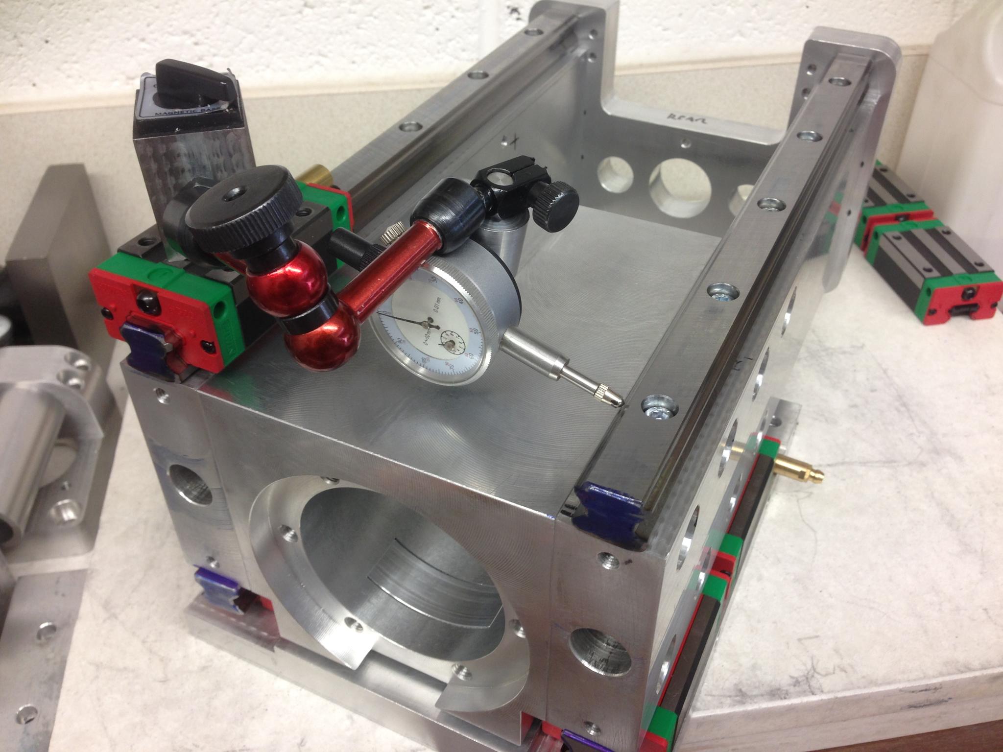 Although I've got to bore out the spindle hole on the spindle block, I thought I'd check everything was going to fit together. Aligning first rail to master datum: