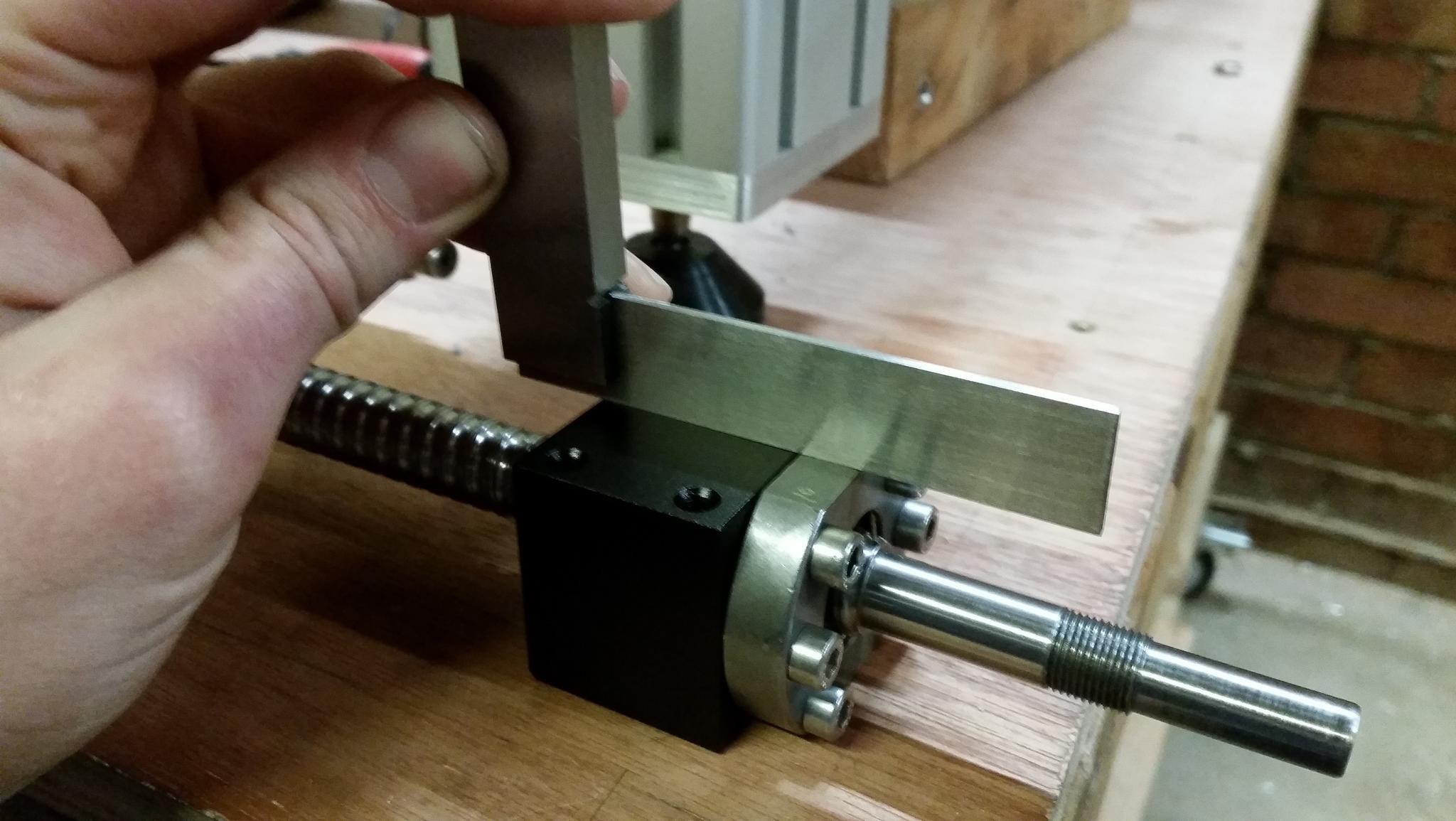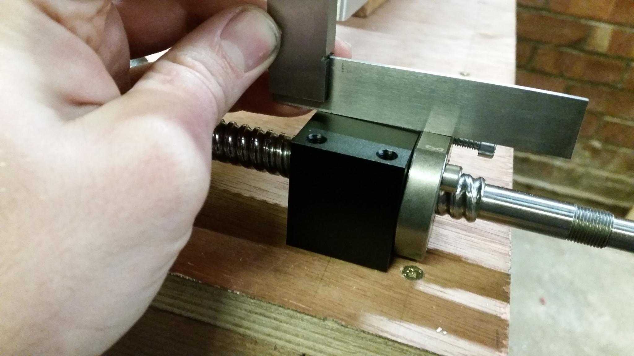 If you have a couple of V blocks you could support the screw in the blocks and put a DTI on the diameter that inserts into the block rotate the nut and record the runout. no idea what the tolerance is for the positioning of the flats but it could be +/- 0.5mm from centre. Dean might be able to better advise, as he is working with this stuff all the time, but if you measure as directed you have better information to give to Fred.