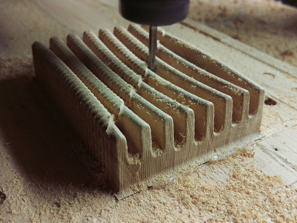 EDIT: To be honest, whilst seeming a bit self-indulgent, there's a fair bit I'm picking up with regards to how VCarve handles 3D objects - specifically how it cuts 'em. i.e. cutting along the troughs is A LOT quicker, but frustratingly if the 0.3mm step-over falls on an area that it's not allowed to get to the bottom of, it just ignores the bit that hasn't been cut - of course, you can get around it by narrowing the step-over or adjusting the raster angle - both of which increase cutting time, but them's the breaks, I guess. As a side note, I ended up going with a 45° raster angle, which gave me a decent enough finish in the troughs but wasn't ideal on the steep sides - using the 45° angle stressed the tool a fair bit too - leading to this: