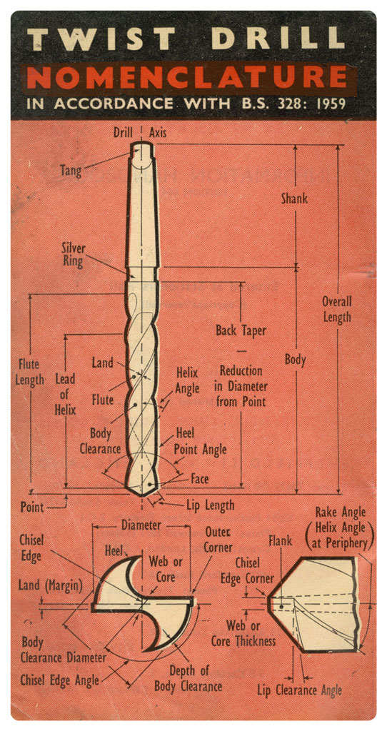 A bit of an odd one this, but I thought it might interest a few of you on here. I came across this old handbook whilst re-homing a few of my dad's tools and other odds and ends. I'm guessing that it dates from the early '60s - around that time he'd have been a turner working as a setter/operator on a capstan lathe. The handbook smells of old-school industry and is full of useful practical info - minimising wear and breakage, re-grinding and point modification, hints for working various materials etc. - I'll add these pages to this post as and when I get 'em scanned. For now, though, here's a bit of reference for those of you who like getting into discussions about which bit of a drill's called what...