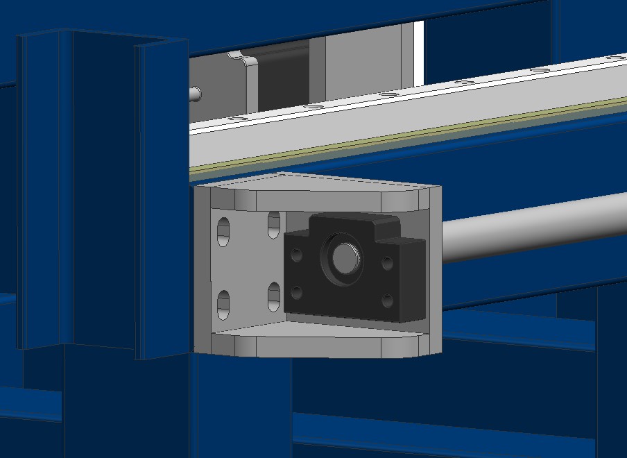 Ballscrew end mounts are slotted in Z to allow Z adjustmet of the ballscrew. Y adjustment will be taken care of with shim spacing from the main frame. The BK/BF supports themselves are bolted to the mounts with no adjustment with the mounts themselves moving on the frame. The motor mount will also be slotted to apply the correct tension. Linear rails will be epoxy mounted.