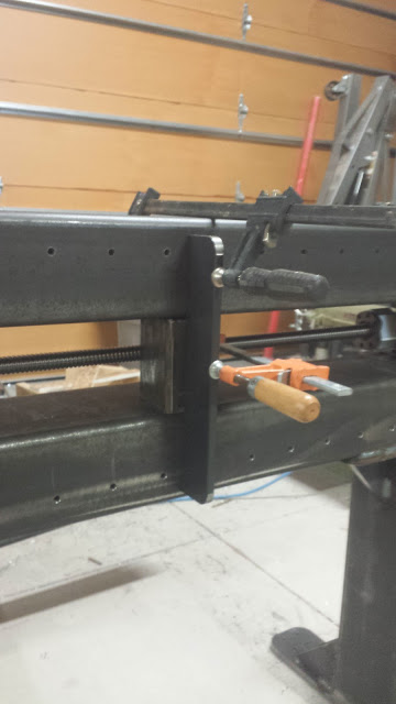All of the bracing clamped in place ready for spot welding. The ballscrew is in place to set the distance between mounts.