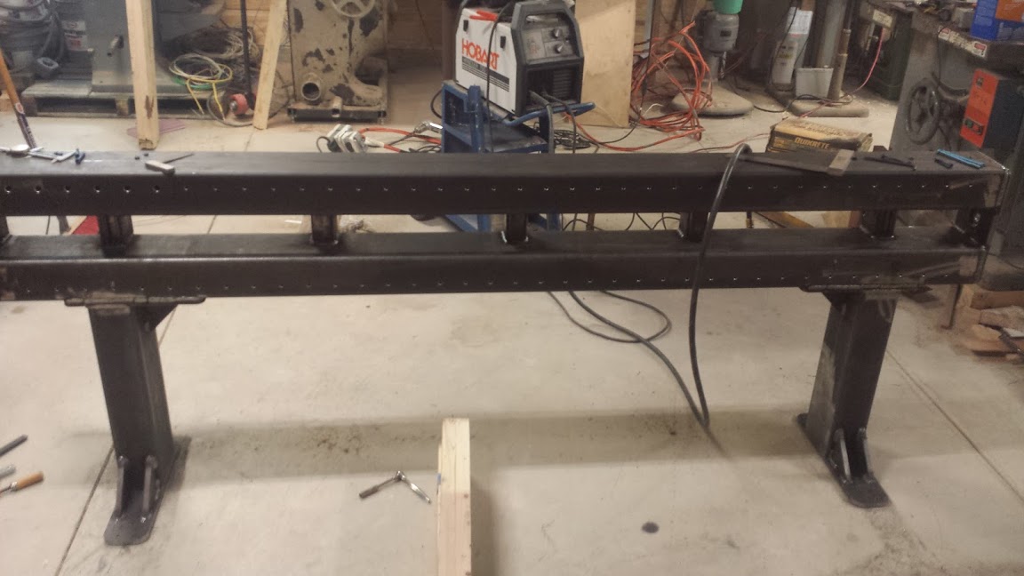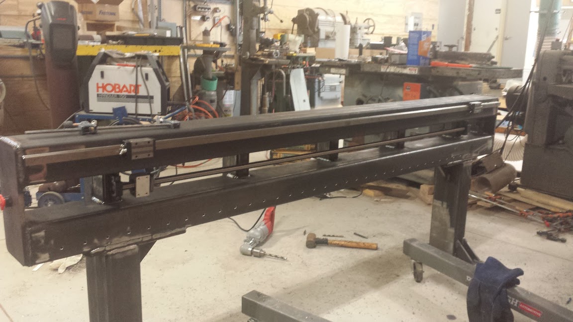 Gantry partially welded up, Gantry is built from 4in x 6in x 1/4in wall box tubing and will get blocking in between the 2 tubing with some vertical bracing on the back. I machined the ends of the gantry before welding them up so I can put an e-stop on each end. The ballscrew is laying ontop of the gantry and will live between the 2 box tubing when complete.