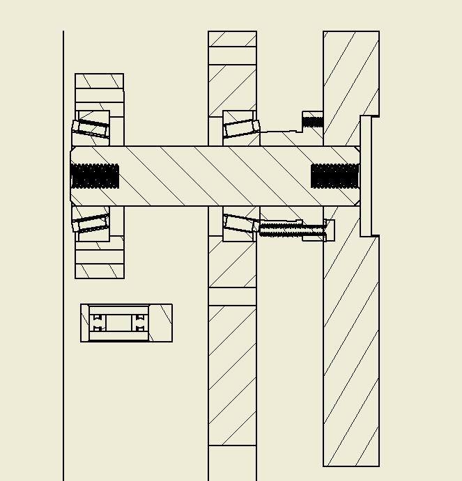 The bearings are roller bearings that I can get from McMaster Carr easily. 1 1/4 diameter shaft. Bearings are designed to be held into aluminum housings bolted into the 3 x6 steel tubing. The shaft is a 6 inch threaded on both ends. Again something I can just order from McMaster. The bolts into the shaft allow me to put preload into the bearings. I was thinking of bolting the pulley hub (pulley is not pictured) to the spindle mount.