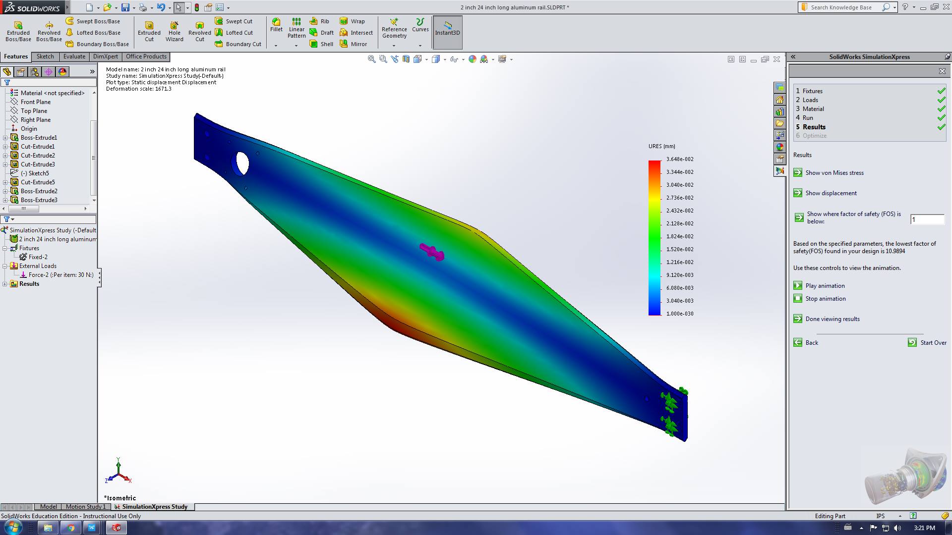 I did do some quick FEA on the rail, and found that it's actually fairly stiff for my purposes. Here's the test if you want to look at it. I'm thinking of using larger rails in the next few iterations that are going make this machine even more ridgid, since the material cost per food is only around 1 or 2 dollars per foot.