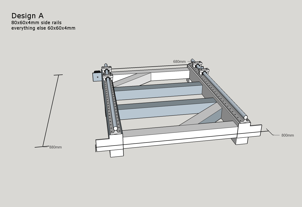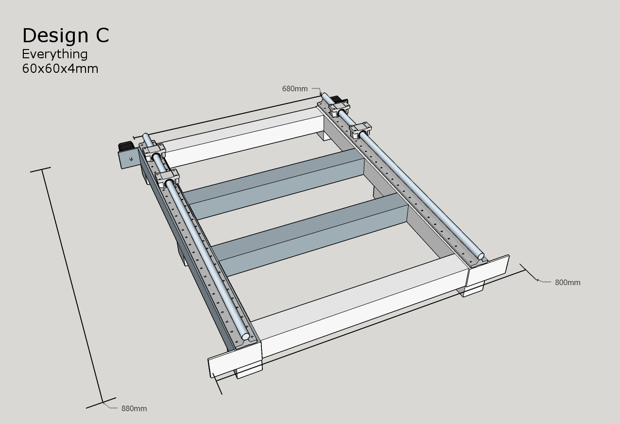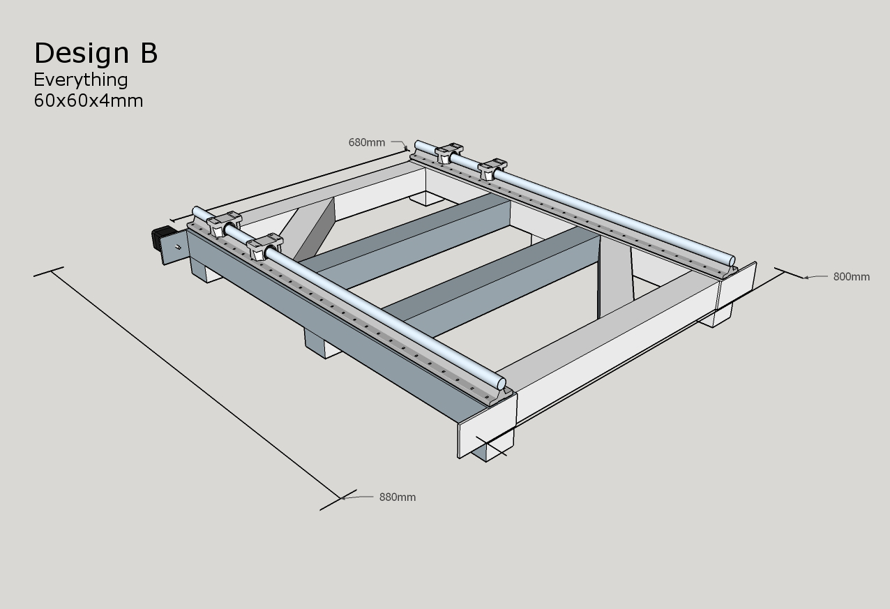 My goal is to make a simple strong build which will be able to cut hard woods and aluminium at a reasonable speeds, I only have room in my workshop for a machine off 900mmx800mm I have done three design off the base A,B,C which I will upload, my abilities on sketchup are also pretty limited so I hope you can make them out ok.I have done the design using 60mmx60mmx4mm box which I would have to buy but I do have 50mmx50mmx4mm box in stock and if I could use it it would save me a few pounds. I can weld ok and hope to weld most off the build and limit the amount off holes to be drilled.I haven't designed a gantry yet as I wanted to get the base right first.My build budget is Around £1500 mark.