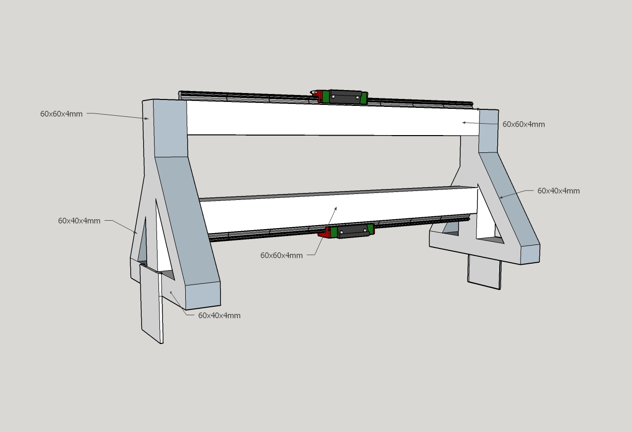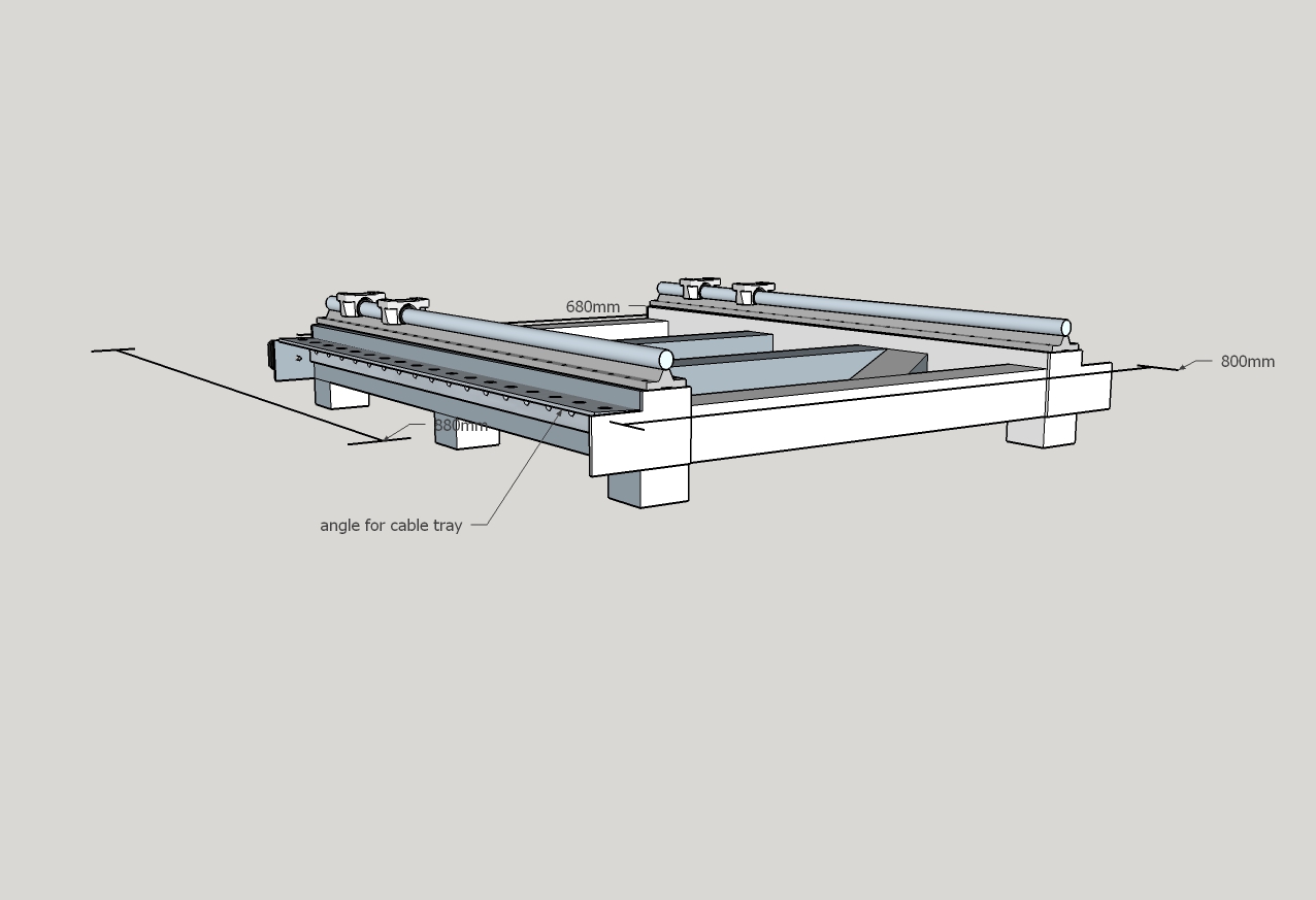 Thanks for the advice JAZZ ,I think I will get 60x60 box for the side rails and use 50x50 for the cross sections and end rail.I plan on just using angle for the cable tray and also it will give some protection to the ballscrew I have put it in the drawings.I plan to make the gantry out off the 50x50 box as I don't mind welding do you think this would be ok? or a waste off time doing.I haven't ordered any rails yet