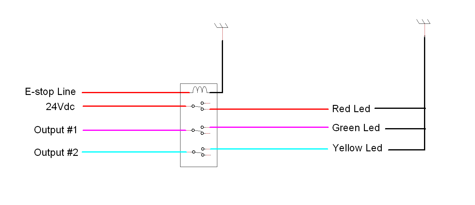 When E-stop is safe Relay will turn on and contacts change state. E-stop Contact will break path to RED LED and make path to Green & Yellow Leds.