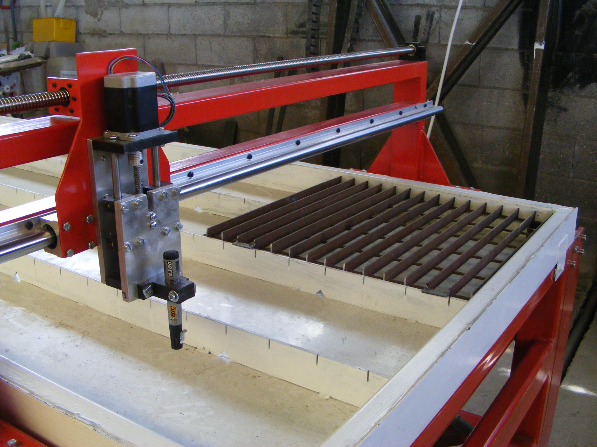 I've made an attempt at building a 8' x 4' water table. Ballscrew x, y, z axis (z axis with 150mm travel was purchased complete off ebay) Currently awaiting delivery of a Hypertherm 45 with machine head. Photo's to follow - please note: constructive criticism greatly appreciated as i've got to learn. Have 3 x nema23 motors (Japanese - forgotten make but will update) all currently direct mounted but the whole thing bolts together. Don't know if these are up to the job. Water table has a drain to catch tank and a pump for refill. 3 phase electrics to the machine plus a neutral for the single phase stuff.