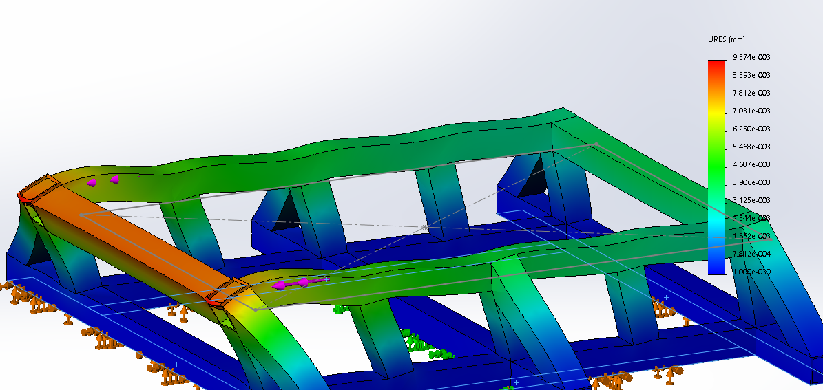 Stiffness; 223 N/um. I tried some different setups for vertical loads on the base. 5 vertical supports on the sides gave 4.8 times more stiftenes on the worst case compared to 3 vertical supports.