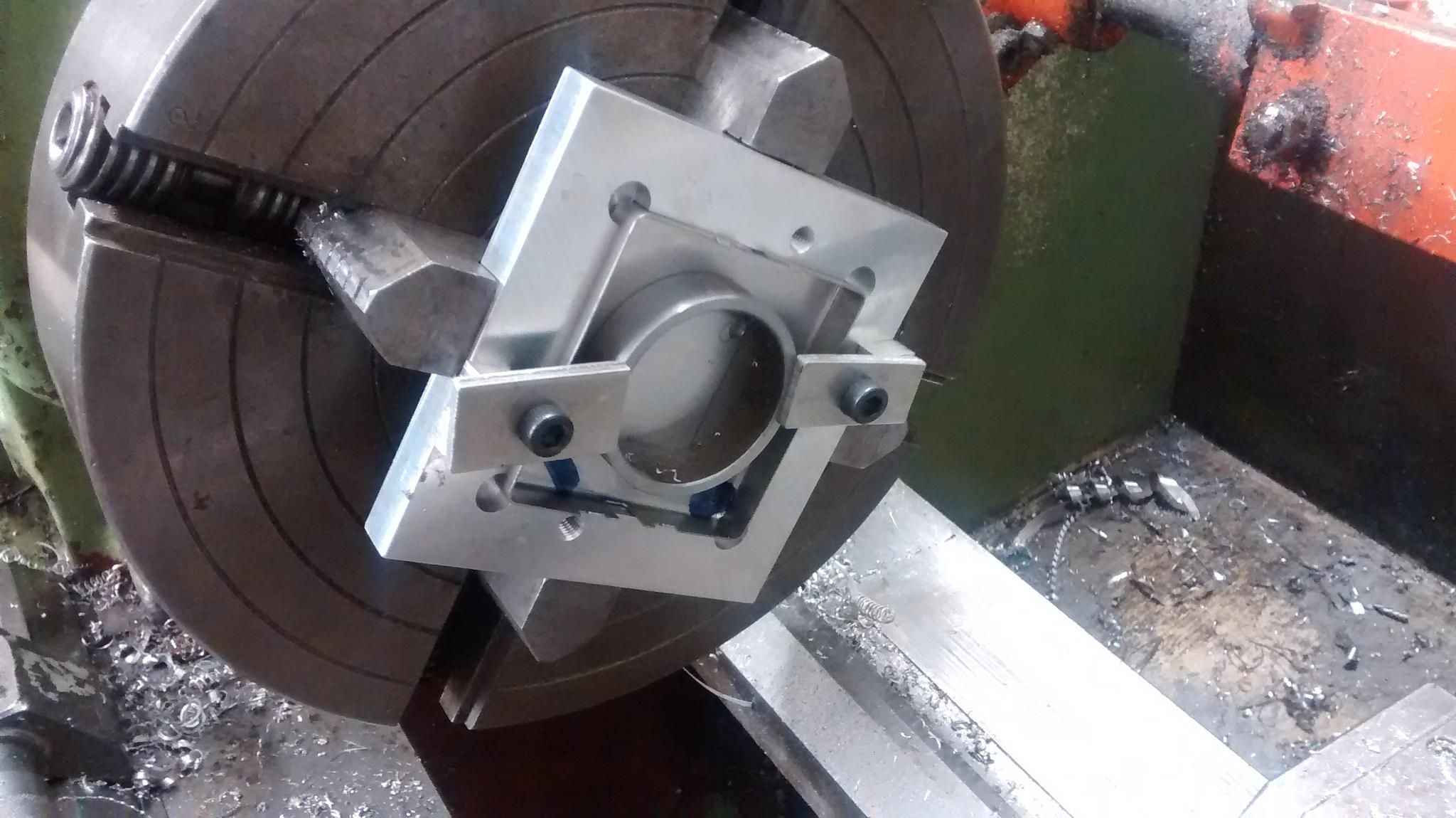 Looking at the dimensions you give and trying to scale off the photograph, you are going to leave around 0.8mm wall thickness at the hinge point, or you are going to need to move the axis of the new bore slightly sideways to leave a bit more metal. Is that going to be strong enough for your application? If I were doing this, I might consider a faceplate (if the workpiece is a good shape for clamping) or maybe even look at holding it in a 4-jaw, although I don't know if you could get a good enough hold without marking or distorting the work, especially as the wall thickness reduces. Be interesting to hear how the professionals would tackle it!